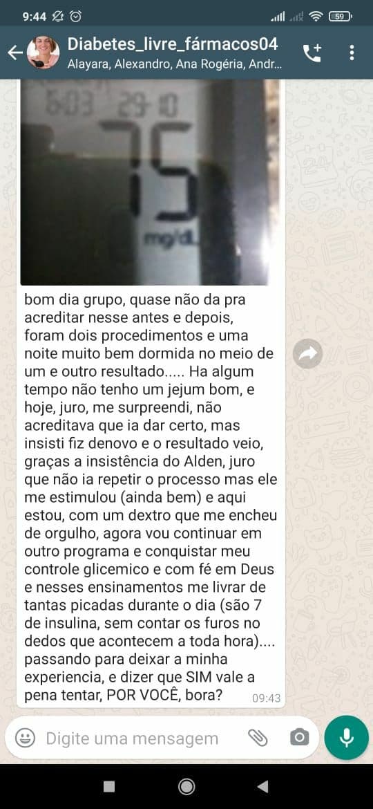 Hoje não precisa de Insulina Rápida e conseguiu diminuir as doses de Insulina Lenta a 15uds, mas, o mais importante, é que hoje está assintomática e tem um projeto de vida que não é apenas se preocupar pela sua saúde. Ela hoje tem Sonos e Metas, antes do tratamento só tinha preocupações?.